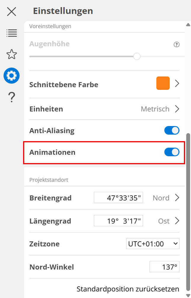 BIMx verwendet automatisch die reale Projektlage, basierend auf Ihren in Archicad eingestellten Standortdaten. Diese Ortsangaben werden in den BIMx-Einstellungen angezeigt, können aber bei Bedarf auch bearbeitet werden.