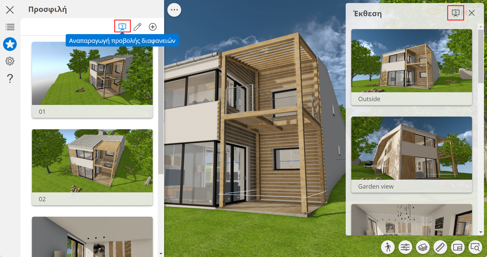Αναπαραγωγή μιας κινούμενης παρουσίασης με βάση τα στοιχεία της Έκθεσης BIMx ή τα Προσφιλή