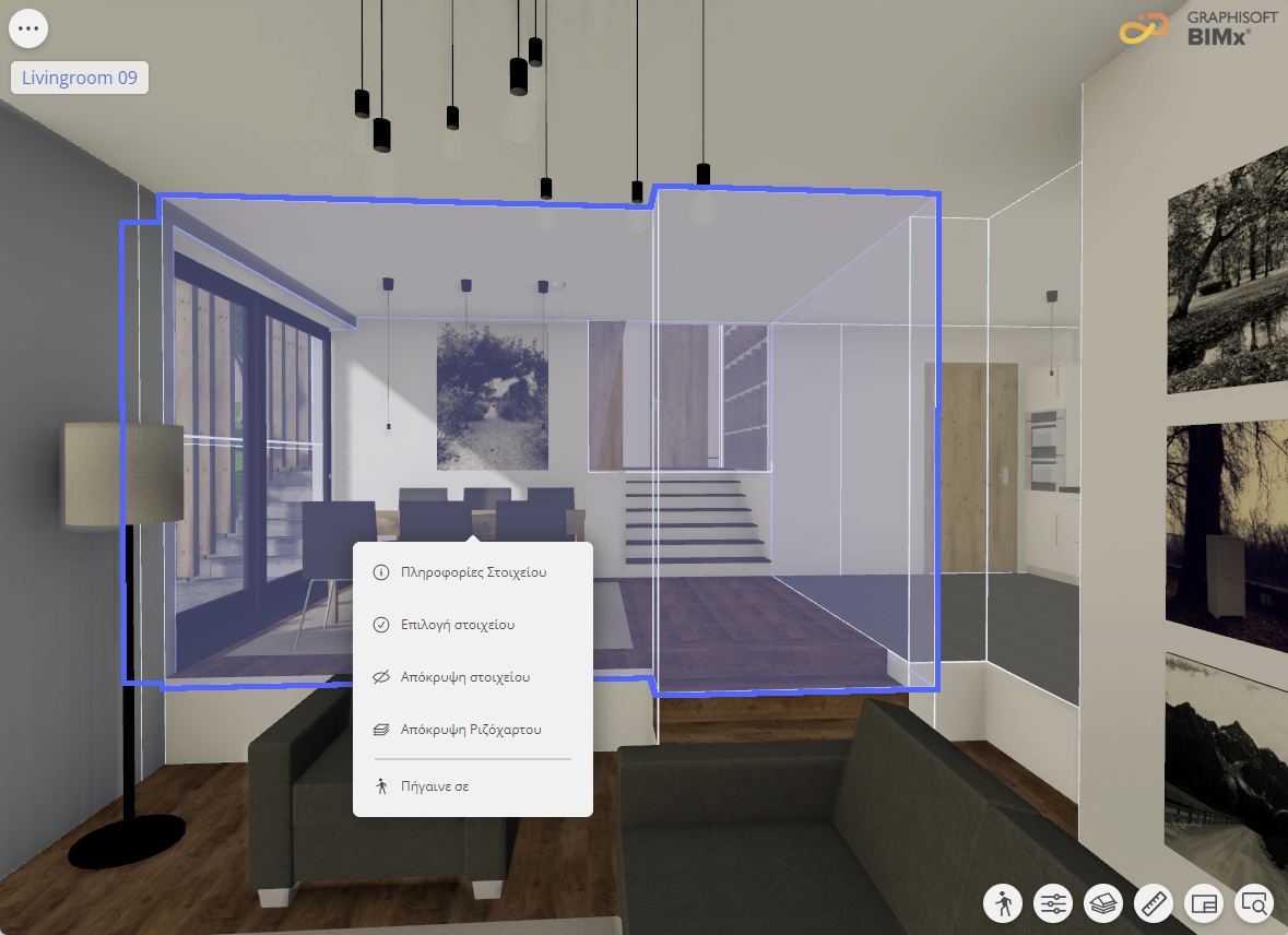 Ενεργοποιήστε την Εμφάνιση Χώρων στο BIMx για να δείτε τους 3D Χώρους (που ορίστηκαν στο Archicad). Οι Χώροι εμφανίζονται ως διαφανή στοιχεία με το χρώμα της Χρήσης Χώρου.