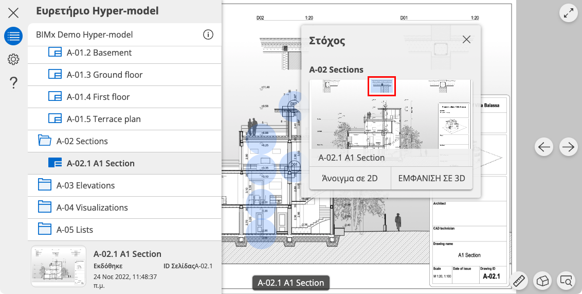 Εάν η Πινακίδα περιέχει πολλαπλές απόψεις, η αντίστοιχη άποψη (π.χ. Κάτοψη ή Τομή) επισημαίνεται με ένα μπλε ορθογώνιο