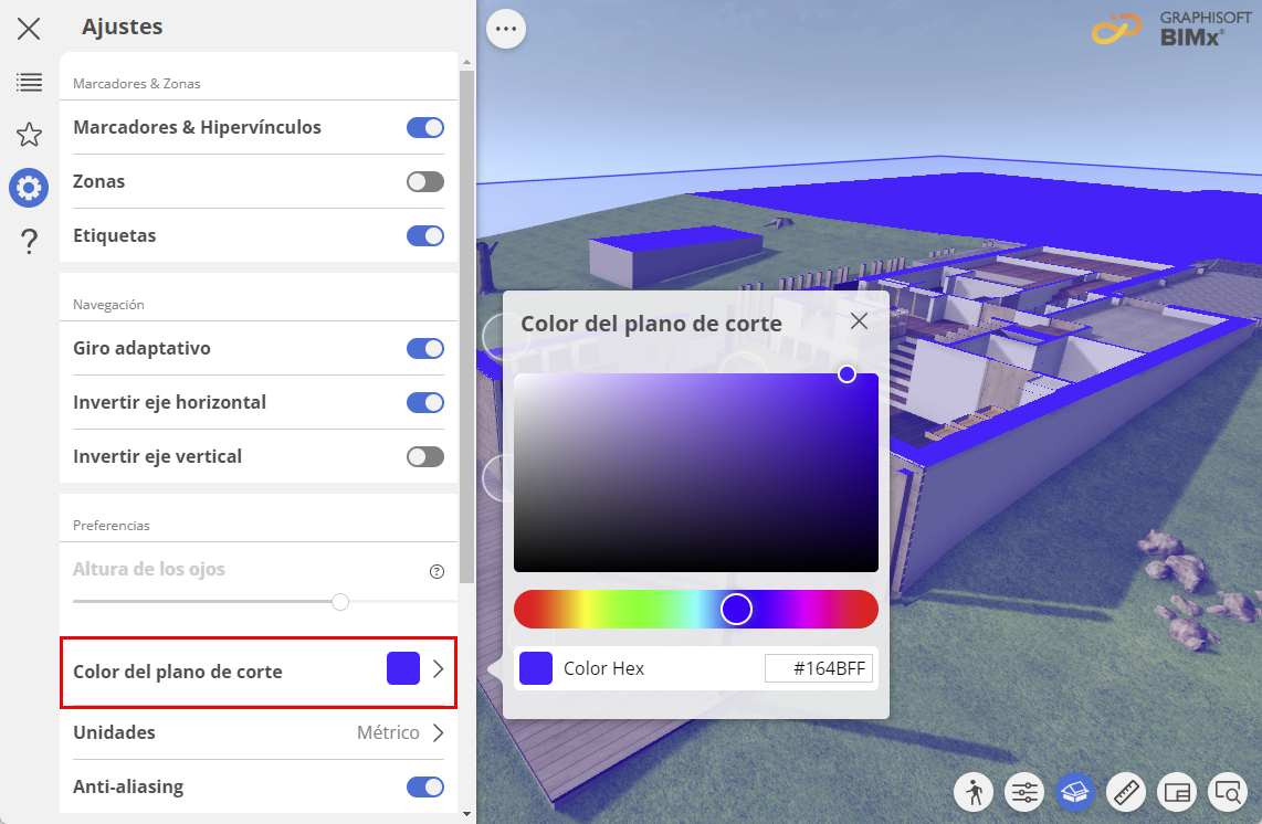 Utilice un color neutro para centrar la atención en el plano o adopte su identidad corporativa con su propia paleta de colores. Sólo tiene que elegir su color personalizado una vez. Se guarda en las Preferencias de BIMx y se aplica a todos los modelos.