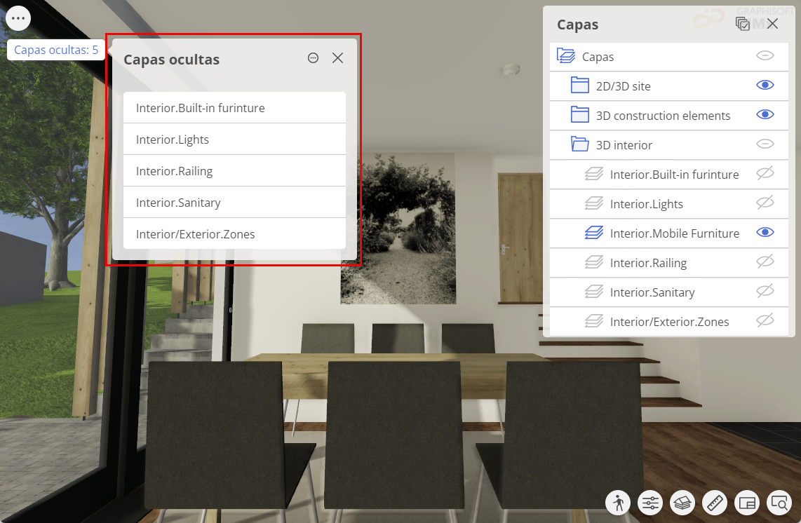 Para saber más sobre el control de la visibilidad de elementos 3D y capas en BIMx, consulte Ocultar elementos 3D y capas en BIMx.