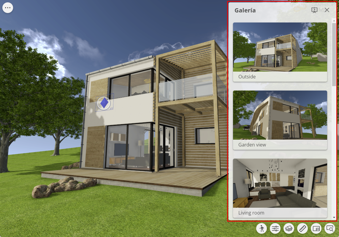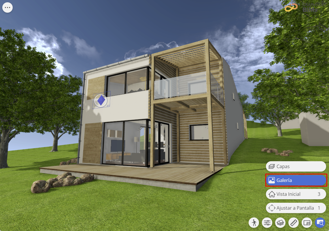 El modelo 3D de su Hiper-modelo BIMx puede incluir una Galería de una o varias posiciones de cámara pregrabadas: vistas 3D estáticas o animaciones. Los elementos de la Galería en BIMx son opcionales; están disponibles si los ha definido en Archicad al publicar el Hiper-Modelo.