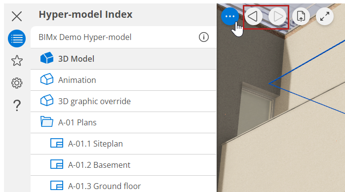 Kumoa / Tee uudelleen Näet navigointikomennot napauttamalla lisäasetusten kuvaketta (...) tai viemällä kursorin sen päälle. Palauta viimeisimmät toiminnot BIMx-mallissa käyttämällä nuolia Kumoa / Tee uudelleen. Pääaihe: Avaa 3D-malli tai 2D-dokumentti