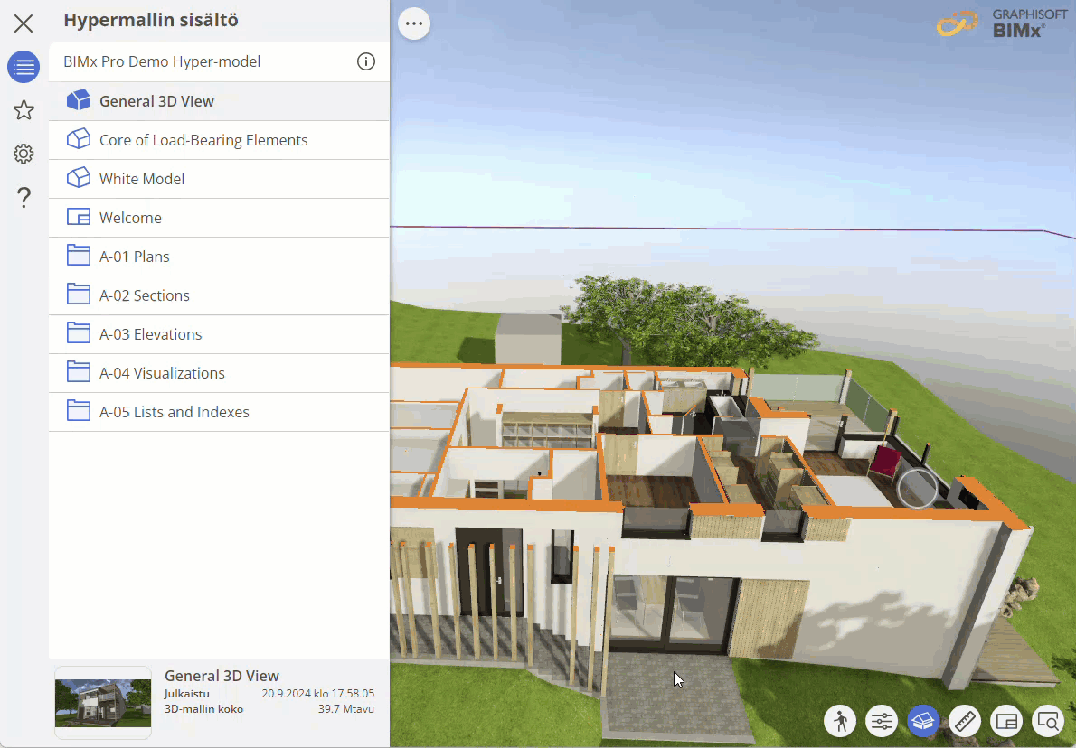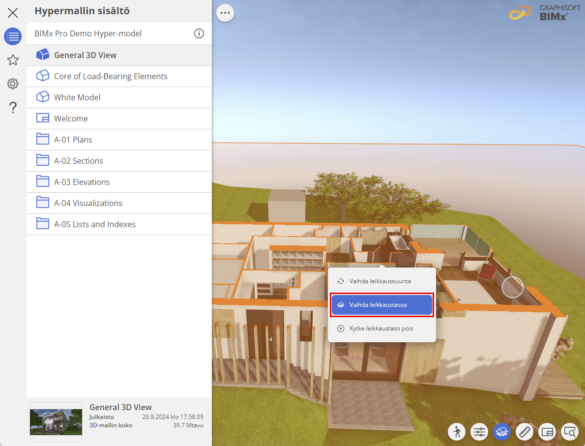 Mukautettava leikkaustaso on BIMx Pro -ominaisuus. Etkö näe sitä? Lue, miten Pro-ominaisuuksia voi käyttää BIMx Pro Licensing -sivustolla