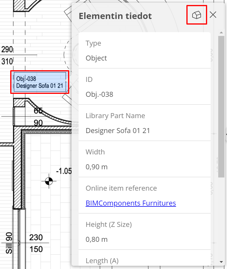 Napsauttamalla merkintää pääset BIM-elementin tietoihin planssista