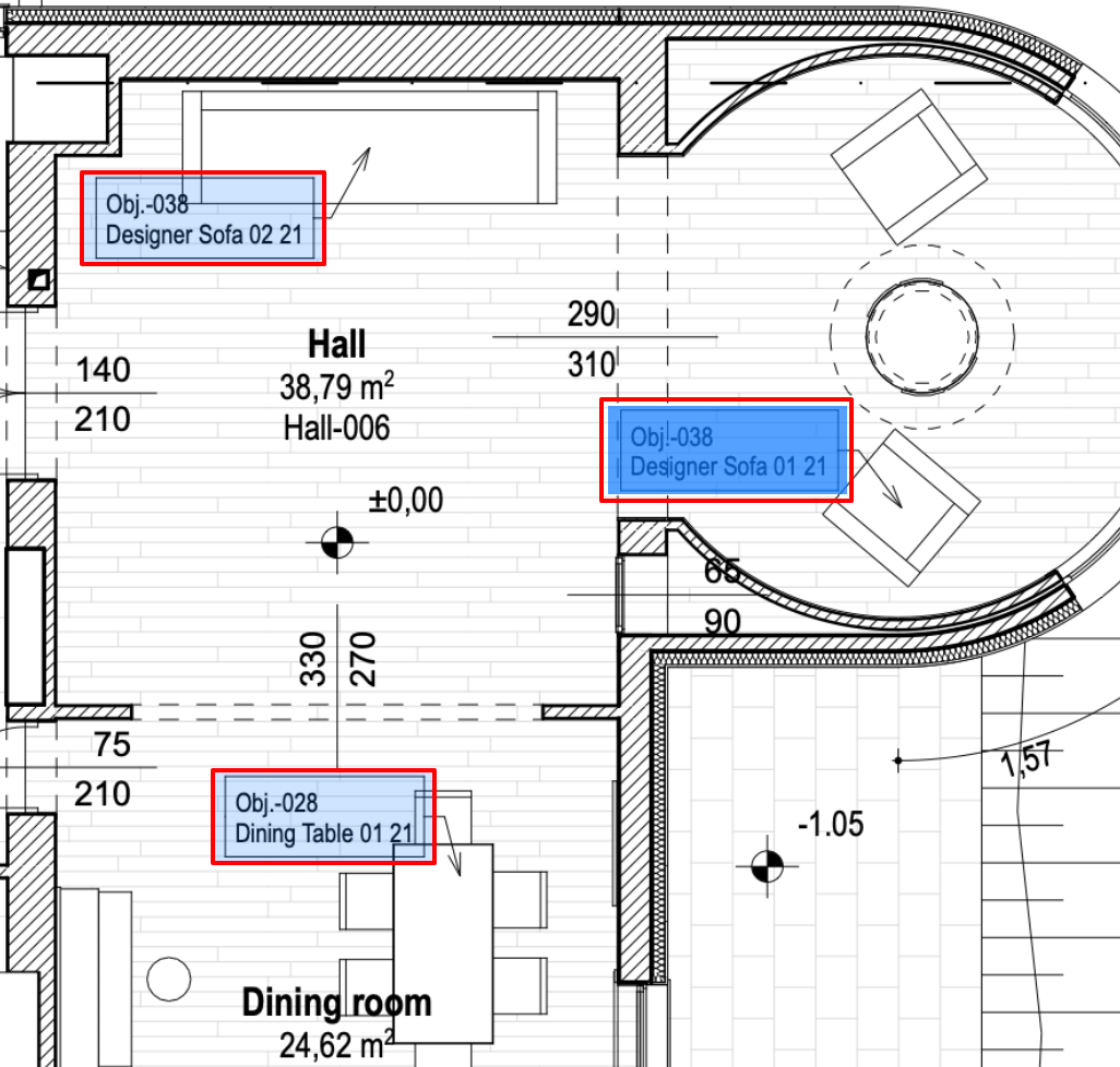 Klikkaa BIMx-asettelussa etikettiä (korostettu sinisellä suorakulmiolla) nähdäksesi tietoja elementistä. (Vuorovaikutteiset suorakulmiot näkyvät 3D-mallin elementeissä, joissa on merkintöjä.)