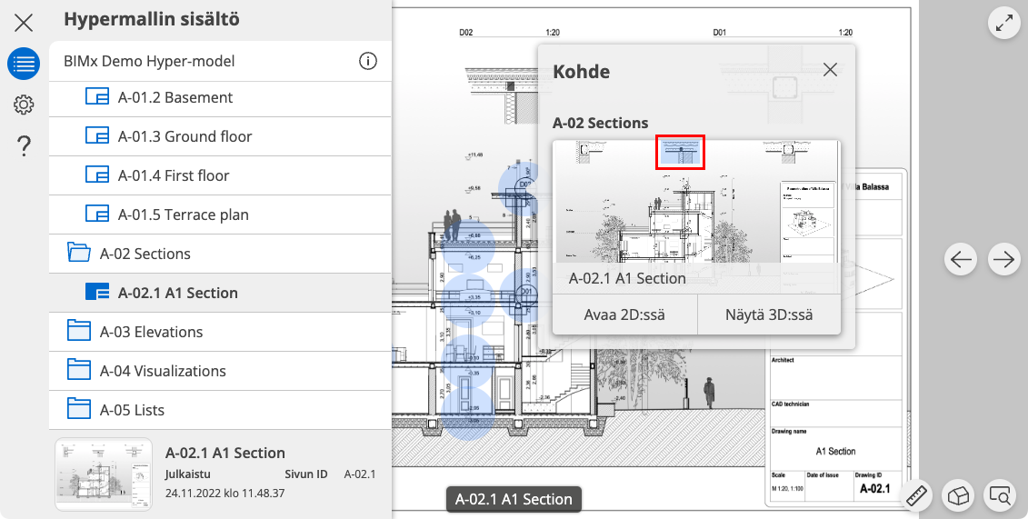 - Jos planssissa on useita näkymiä, kyseinen näkymä (esim. pohjapiirros tai leikkaus) korostetaan sinisellä suorakulmiolla
