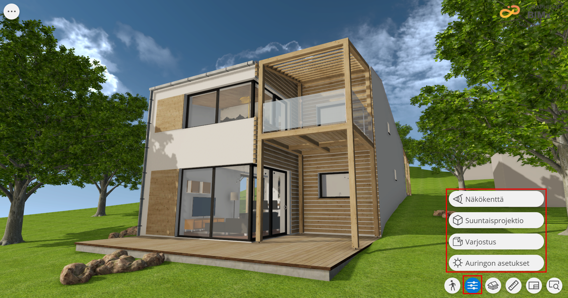 Vinkki: Kaksoisnapsauttamalla tai -napauttamalla elementtiä saat esiin rakennuksen etunäkymän. Se auttaa luomaan korkeusasema- tai leikkausnäkymiä aksonometriassa helposti. Voit yhdistää sen leikkaustasoon tai erilaisiin auringon ajanmukaisiin asetuksiin ja tallentaa suosikkinäkymiäsi.