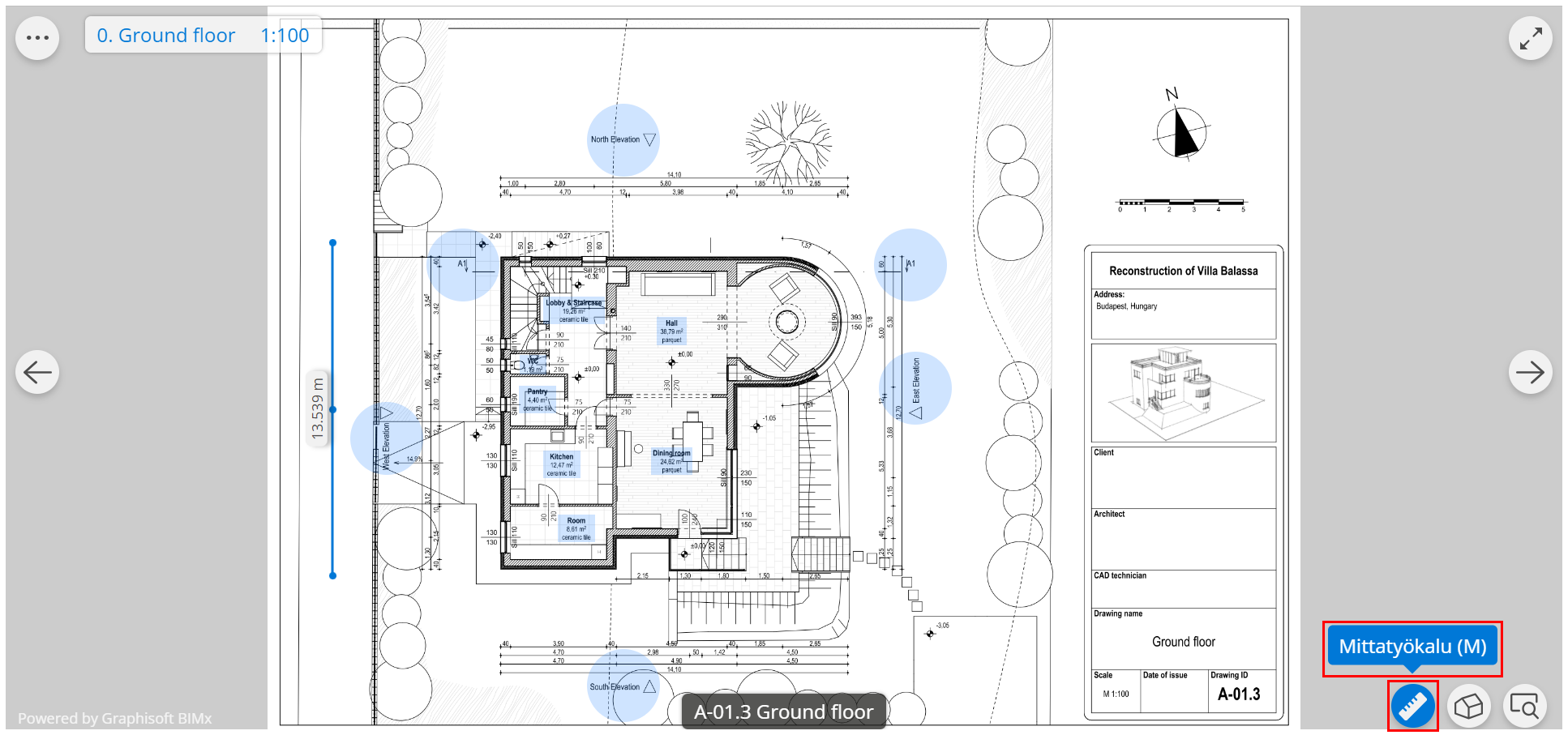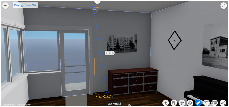 Avaa mikä tahansa 3D-malli, joka on BIMx-hypermallissasi. Mittaustyökalu toimii lähes samoin kuin 2D-työkalussa, mutta seuraavin eroin: