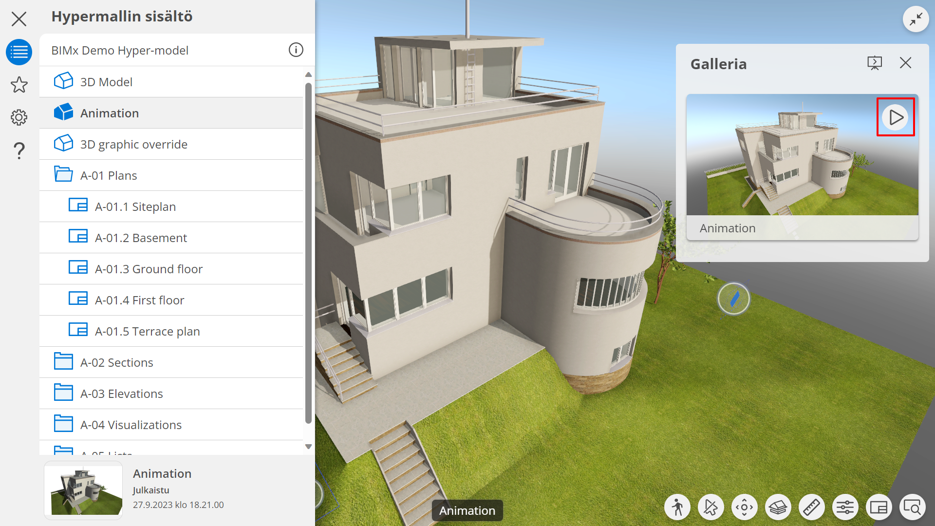 Jos galleriakohde on tallennettu Archicadissa kamerapoluksi, BIMx-galleriakohteessa näkyy toistopainike.