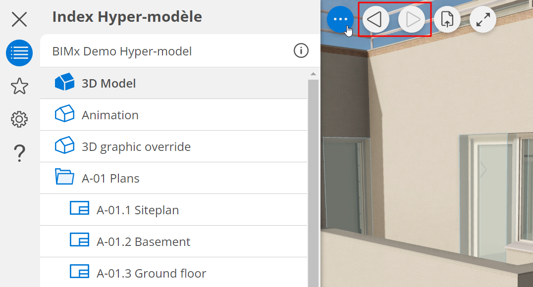 Annuler/Rétablir Survolez ou touchez l'icône "plus d'options" (...) pour voir les commandes de navigation. Utilisez les flèches Annuler/Rétablir pour rétablir vos dernières actions dans le modèle BIMx. Sujet parent : Ouvrir un modèle 3D ou un document 2D