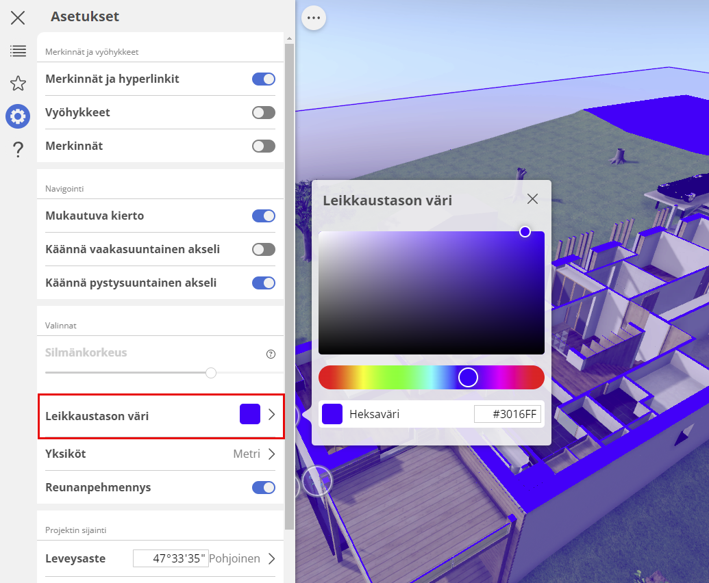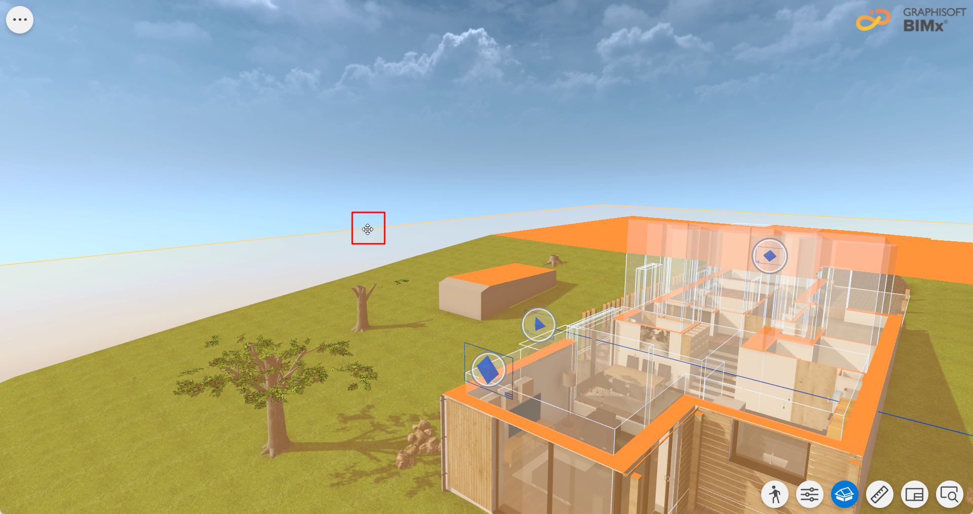 - Placez le curseur sur le cadre pour afficher le plan de coupe. Vous pouvez modifier la couleur du plan de coupe à l'aide du sélecteur de couleur du plan de coupe dans les Réglages de BIMx. Voir Sélecteur de couleurs du Plan de coupe