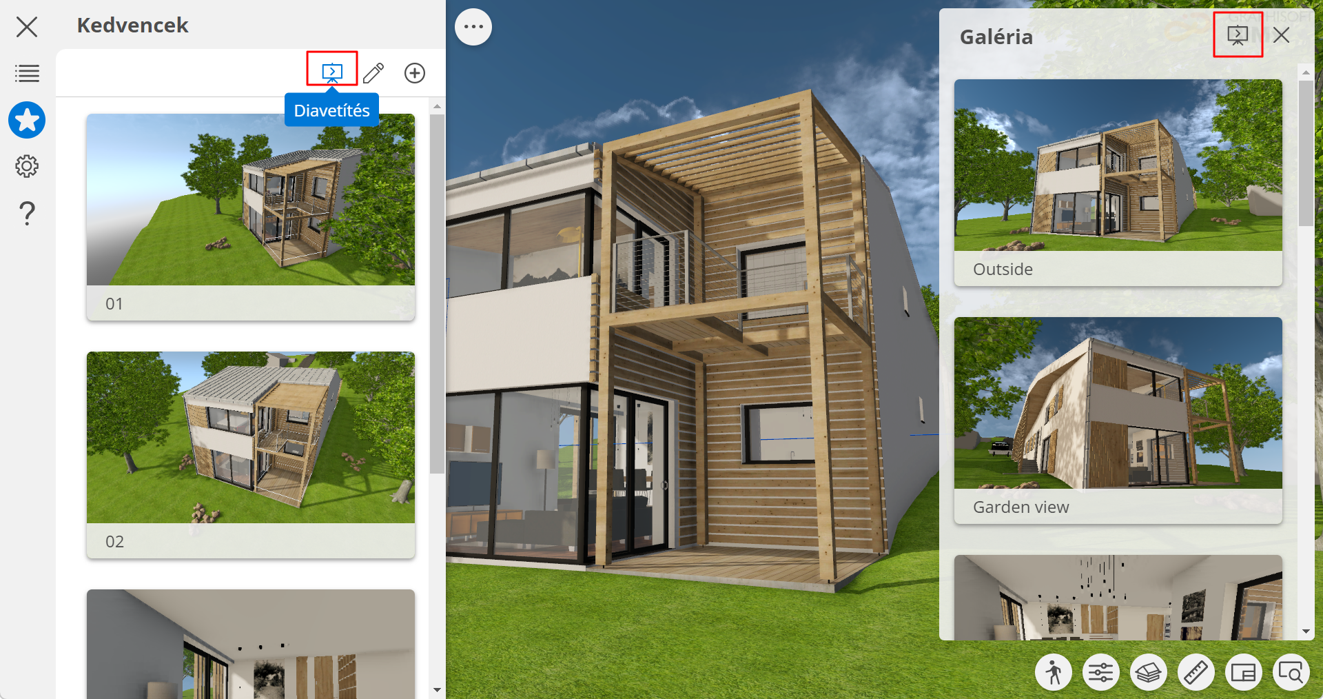 Animált bemutató lejátszása a BIMx Galéria elemei vagy a Kedvencek alapján.