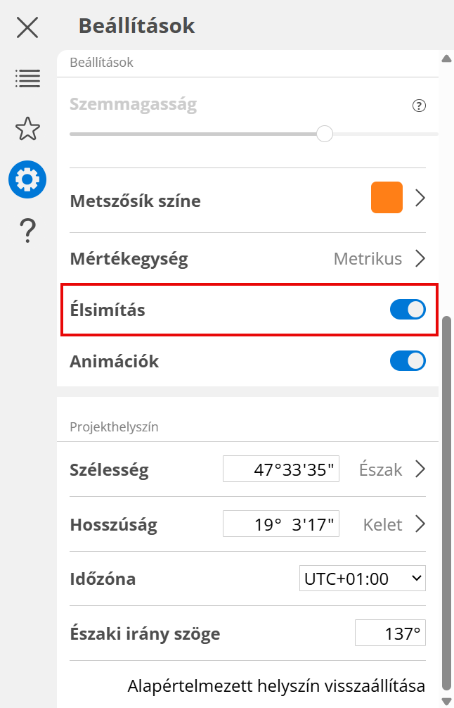 A simítás alapértelmezés szerint be van kapcsolva, hogy a BIMx 3D nézetekben simább éleket biztosítson.