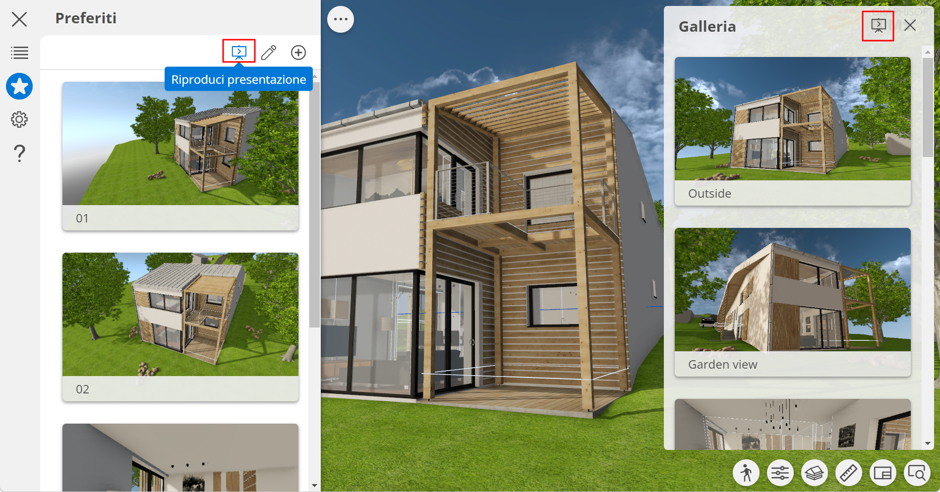 Riprodurre una presentazione animata basata sugli elementi della Galleria BIMx o sui Preferiti