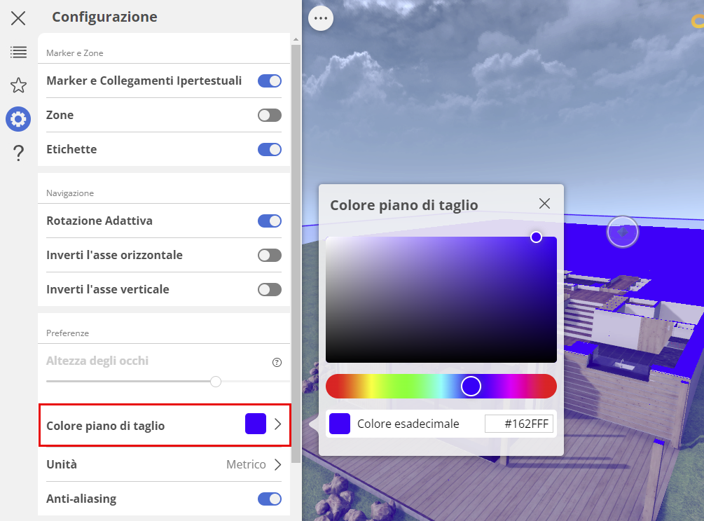- Passare il mouse sul riquadro per visualizzare il piano di taglio. È possibile modificare il colore del piano di Taglio utilizzando il Picker del colore del piano di Taglio in Impostazioni BIMx. Vedere Picker del colore del piano di Taglio