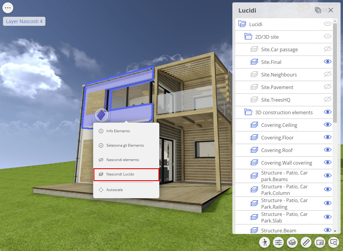 Per saperne di più su come controllare la visibilità degli elementi 3D e dei lucidi, vedere Nascondere elementi e lucidi nel 3D in BIMx.
