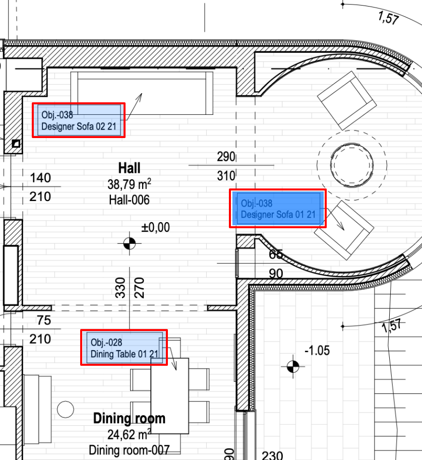 Su un layout in BIMx, è sufficiente fare clic su un'etichetta (evidenziata da un rettangolo blu) per visualizzare le informazioni sull'elemento. (Sugli elementi del modello 3D che hanno etichette appaiono dei rettangoli interattivi.)