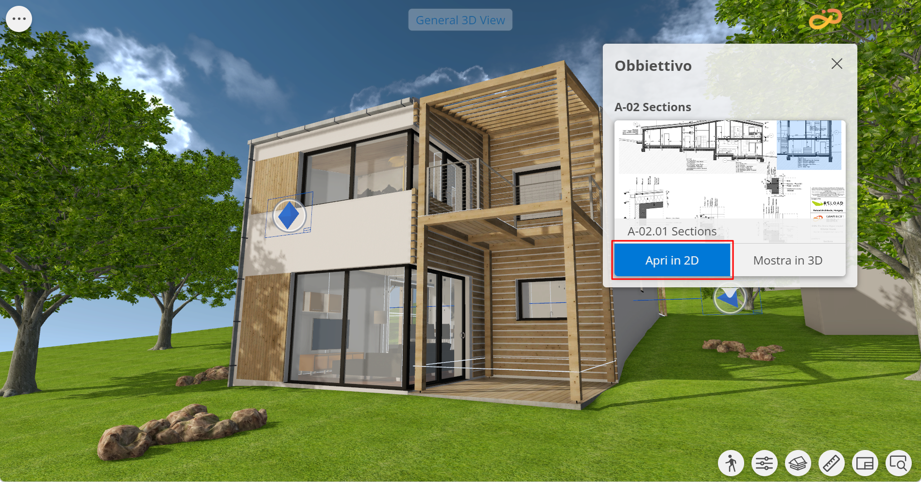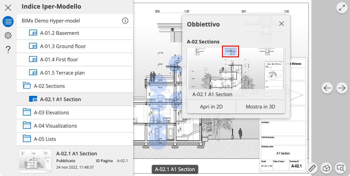 Nella finestra di dialogo Destinazione, fare clic su Apri in 2D o Mostra in 3D per attivare la vista desiderata. (O fare clic sull'anteprima del layout).