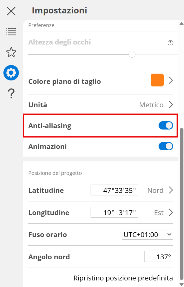 L'anti-aliasing potrebbe influire sulle prestazioni. Se si verificano rallentamenti nella navigazione, provare a disattivare l'anti-aliasing nel menu delle impostazioni.