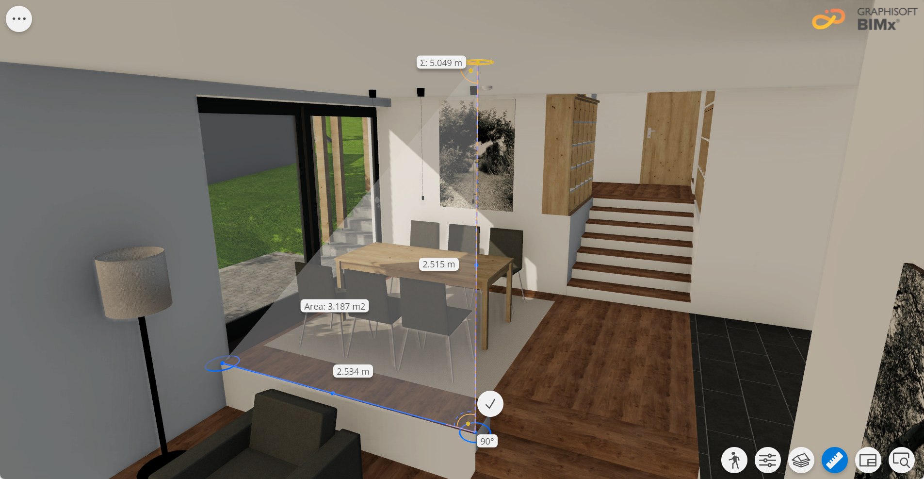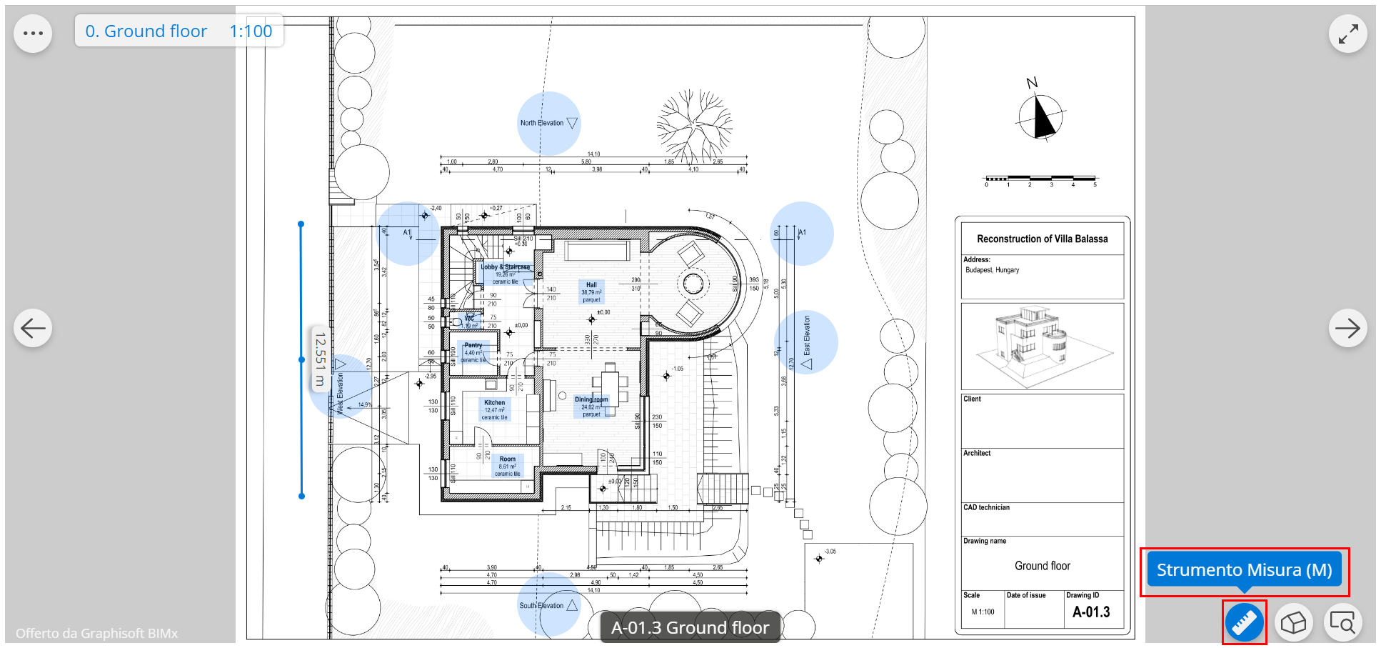 Aprire qualsiasi modello 3D presente nel proprio Iper-Modello BIMx. Lo strumento Misura funziona quasi come in 2D, ma con le seguenti differenze: