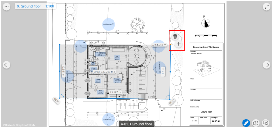 Fare clic su uno dei "punti di Snap". Una volta fatto clic, verrà visualizzato il puntatore lente d'ingrandimento e sarà possibile aggiornare la forma dell'area selezionata. Se si desidera eliminare questo punto specifico, fare clic su di esso e accanto al punto verrà visualizzata l'opzione "Cancella". Se il punto toccato si trova alla fine della linea di misura, oltre a "Cancella" viene visualizzata anche l'opzione "Aggiungi punto" per consentire di estendere la misura con un nuovo punto.