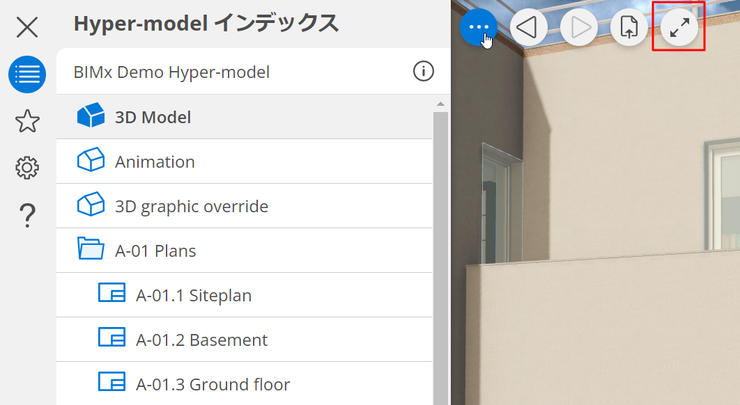 フルスクリーン(ショートカット:F) 画面全体に表示を拡大 2Dドキュメントまたは3Dモデルで、次のいずれかの手順を行います: Fを押します 三点メニューから、フルスクリーンアイコンをクリックします。 終了するには、フルスクリーンアイコンをクリックするか、Fキー、またはEscキーを押します。 親トピック: 画面表示のショートカット
