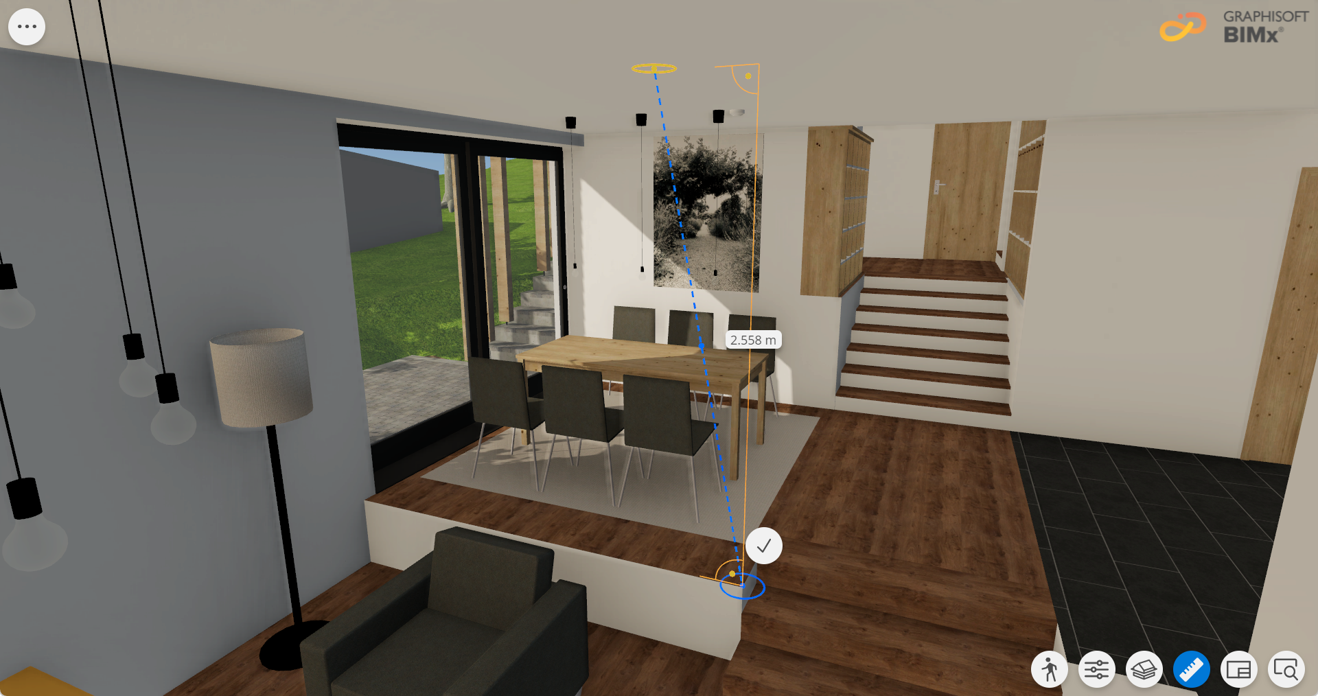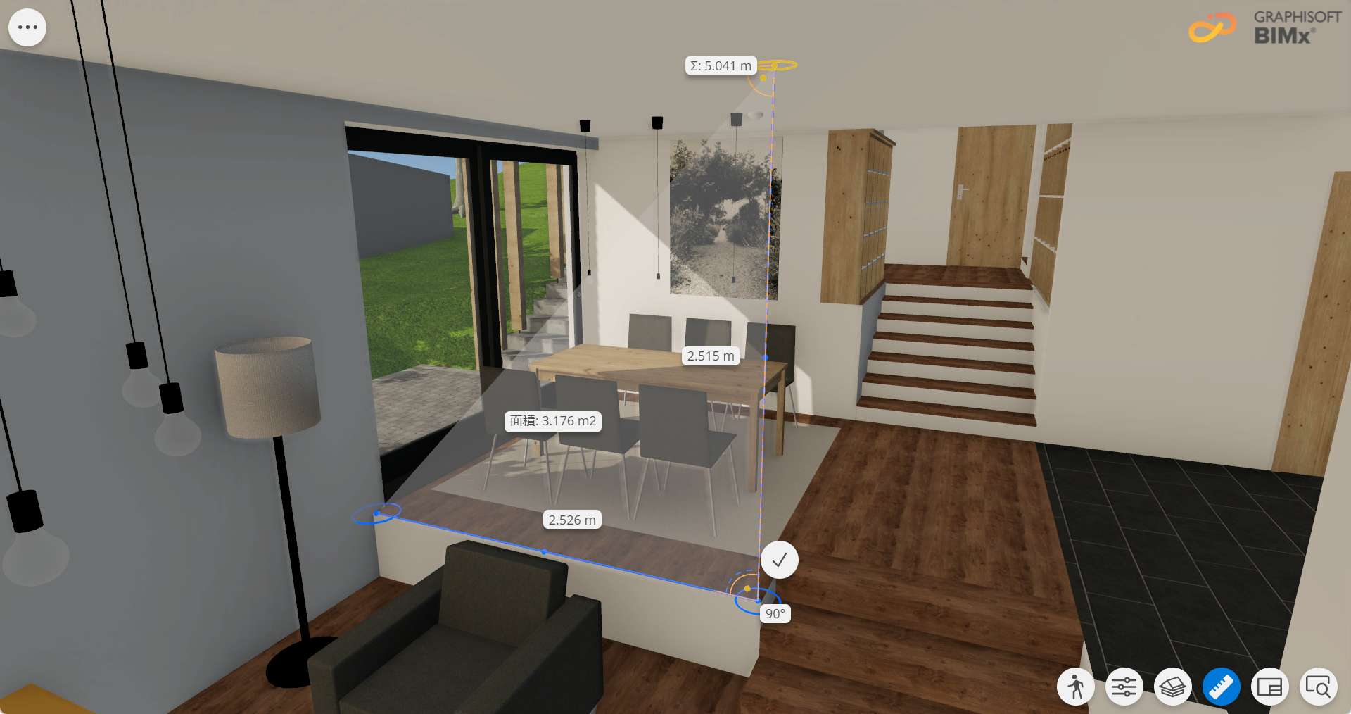 BIMx Hyper-modelにある3Dモデルを開きます。計測ツールは2Dの場合とほぼ同じように動作しますが、以下の点が異なります: