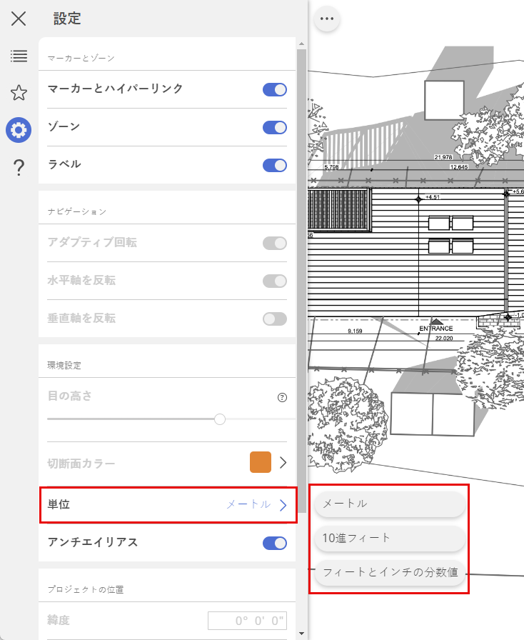 単位をメートルとインペリアルで切り替える場合は、[設定]を開いてリストから単位を選びます。