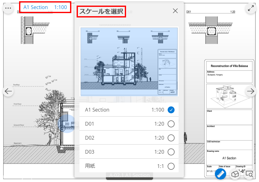 - 上部の一角に図面名が表示されます。図面名をクリックすると、レイアウト上のスケールと図面のリストが表示されます。