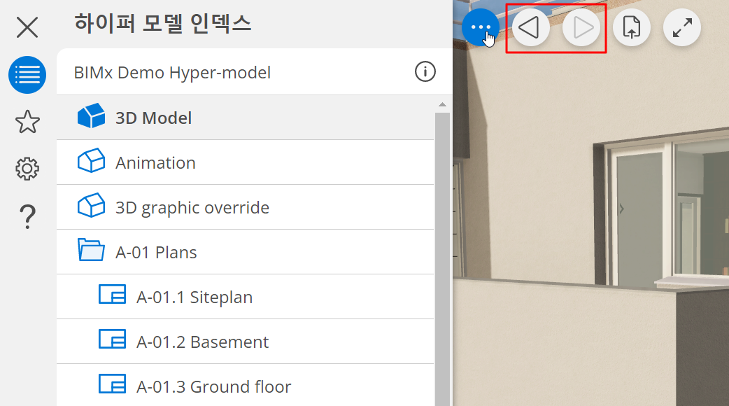 명령 취소/명령 복구 탐색 명령을 보려면 "추가 옵션" 아이콘(...)을 마우스로 가리키거나 탭 하세요. BIMx 모델에서 최근 동작으로 되돌리려면 실행 취소/다시 실행 화살표를 사용하세요. 상위 주제: 3D 모델 또는 2D 문서 열기