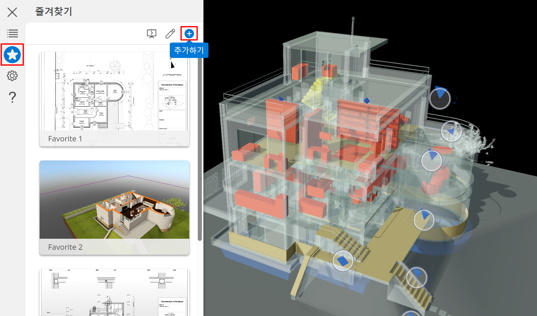 갤러리 (Archicad 3D 모델에서 저장된 카메라 위치가 포함된)와 달리 즐겨찾기는 하이퍼 모델의 2D 또는 3D 항목에서 원하는 방식으로 모든 3D 설정을 포함하여 BIMx에 저장됩니다. BIMx에서 즐겨 찾는 프레젠테이션의 순서와 표시 여부를 쉽게 편집할 수 있습니다.