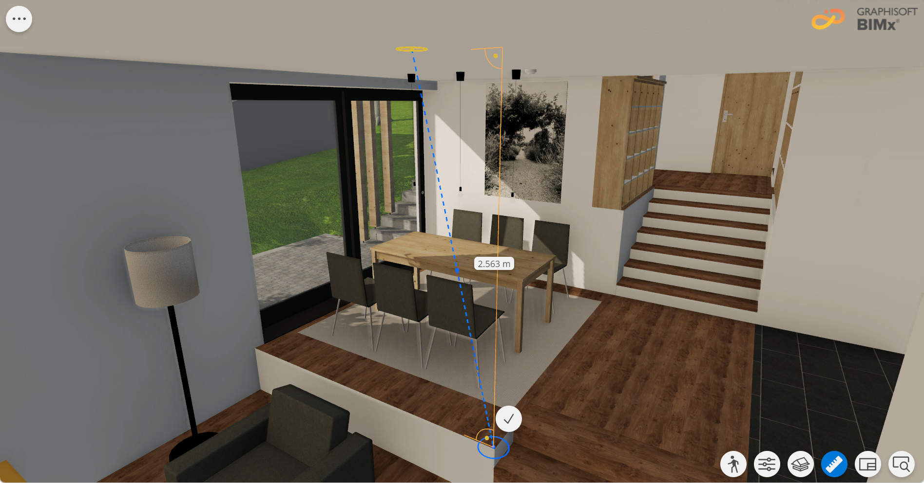 BIMx 하이퍼 모델에 있는 3D 모델을 엽니다. 측정 도구는 2D에서와 거의 동일하게 작동하지만 다음과 같은 차이점이 있습니다.