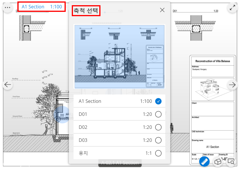 - 도면 이름은 상단 모서리 중 하나에 표시됩니다. 도면 이름을 클릭하면 레이아웃에 축척 & 도면 목록이 표시됩니다.