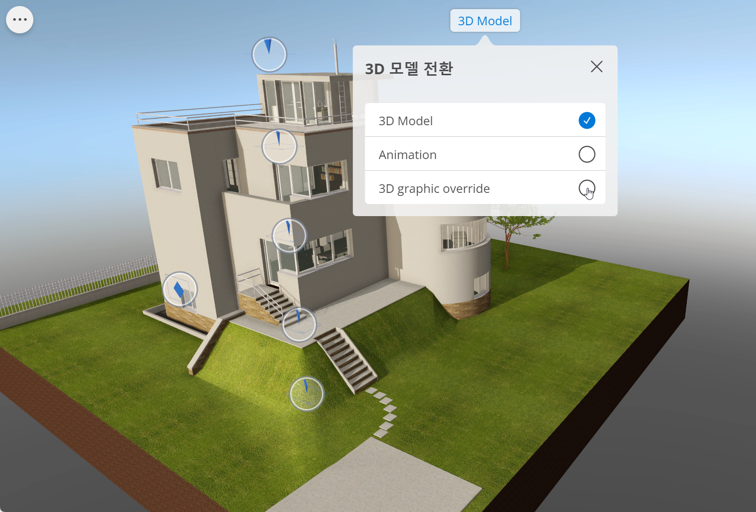 현재 카메라 위치와 3D 설정 (컷 모델, 음영, 태양 위치)을 유지하면서 즉시 전환할 수 있습니다.