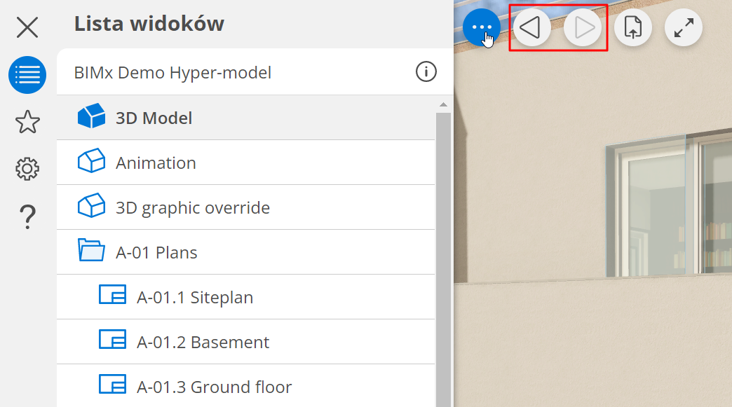 Cofnij/Ponów Najedź kursorem na ikonę „więcej opcji” (…) lub dotknij jej, aby wyświetlić polecenia nawigacyjne. Użyj strzałek Cofnij/Ponów, aby ponowić ostatnie działania w modelu BIMx. Temat nadrzędny: Otwórz model 3D lub dokument 2D