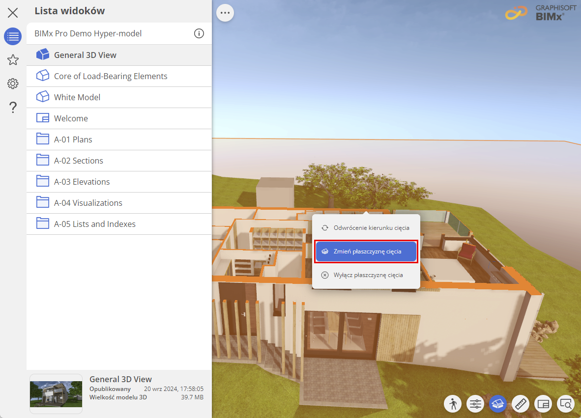 Konfigurowalna płaszczyzna cięcia jest funkcją Pro BIMx. Nie widzisz tego? Dowiedz się, jak uzyskać dostęp do funkcji Pro w Licencjonowaniu Pro BIMx