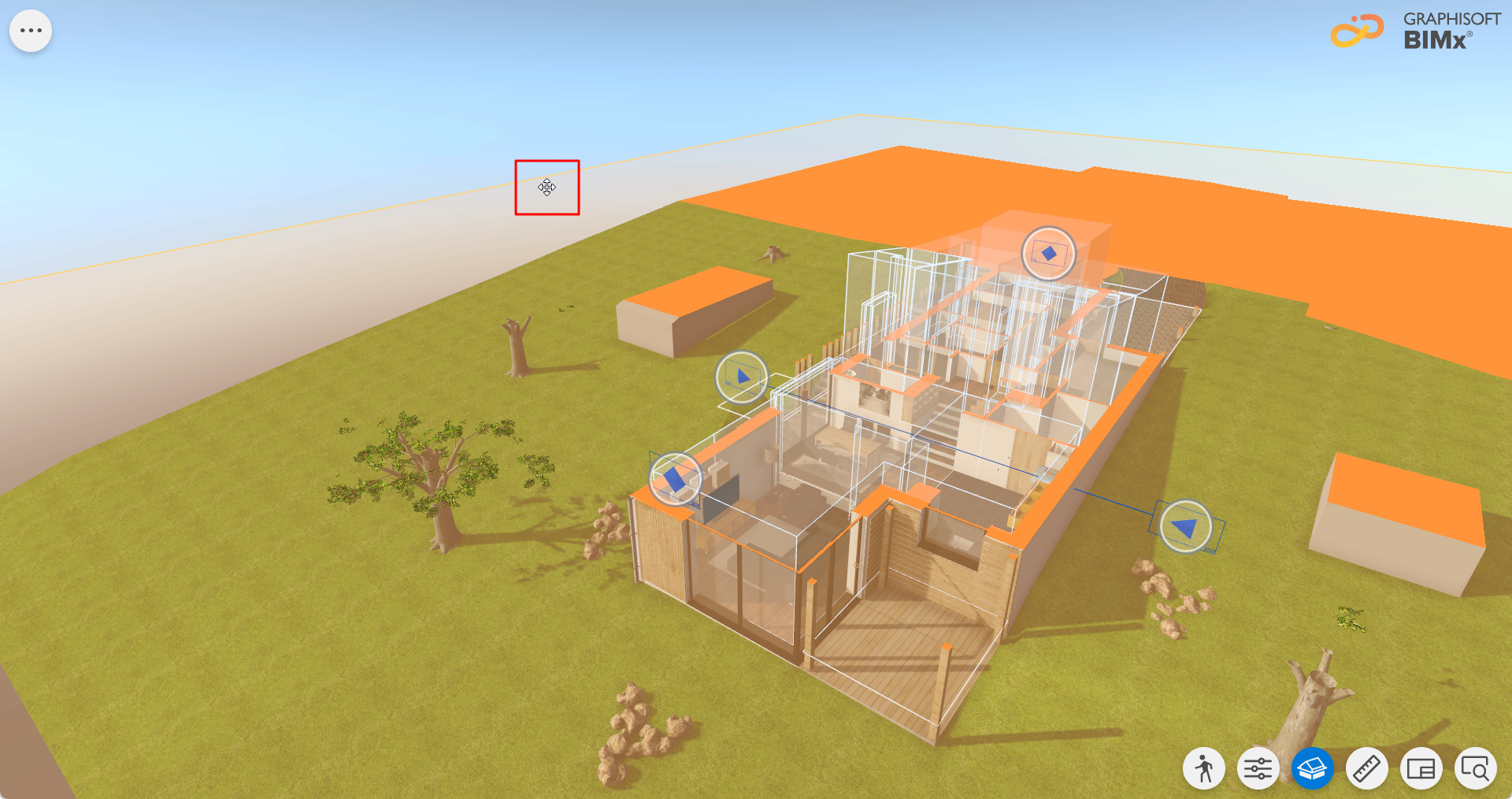 5. Najedź kursorem na ramkę, aby wyświetlić płaszczyznę cięcia. Kolor płaszczyzny cięcia możesz zmienić za pomocą palety wyboru koloru płaszczyzny cięcia w ustawieniach BIMx. Zobacz Paleta wyboru koloru płaszczyzny cięcia