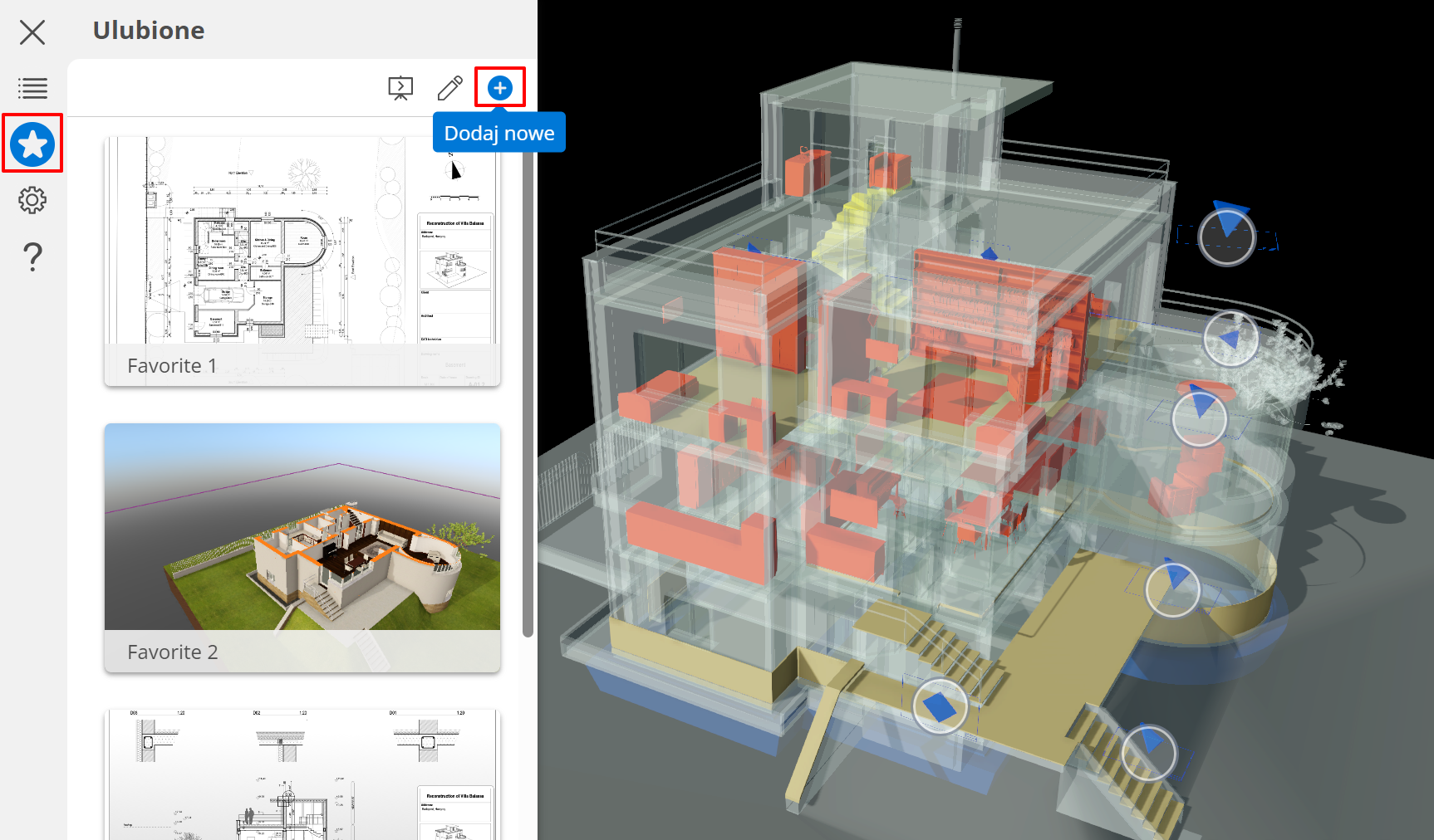 W przeciwieństwie do Galerii (która zawiera pozycje kamery zapisane z modelu Archicad 3D), Ulubione są zapisywane w BIMx z dowolnego elementu 2D lub 3D w Hipermodelu, uwzględniając wszystkie ustawienia 3D tak, jak lubisz. W BIMx można łatwo edytować kolejność i widoczność prezentacji Ulubionych.