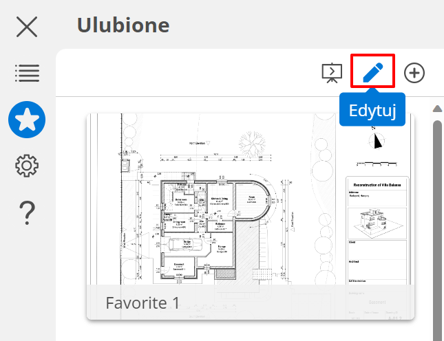W przeciwieństwie do elementów Galerii, które są częścią Hipermodelu, Ulubione są przechowywane na komputerze (BIMx Desktop) lub w przeglądarce internetowej (BIMx Web). Jeśli więc udostępnisz swój Hipermodel, nie będzie obejmować to Ulubionych.