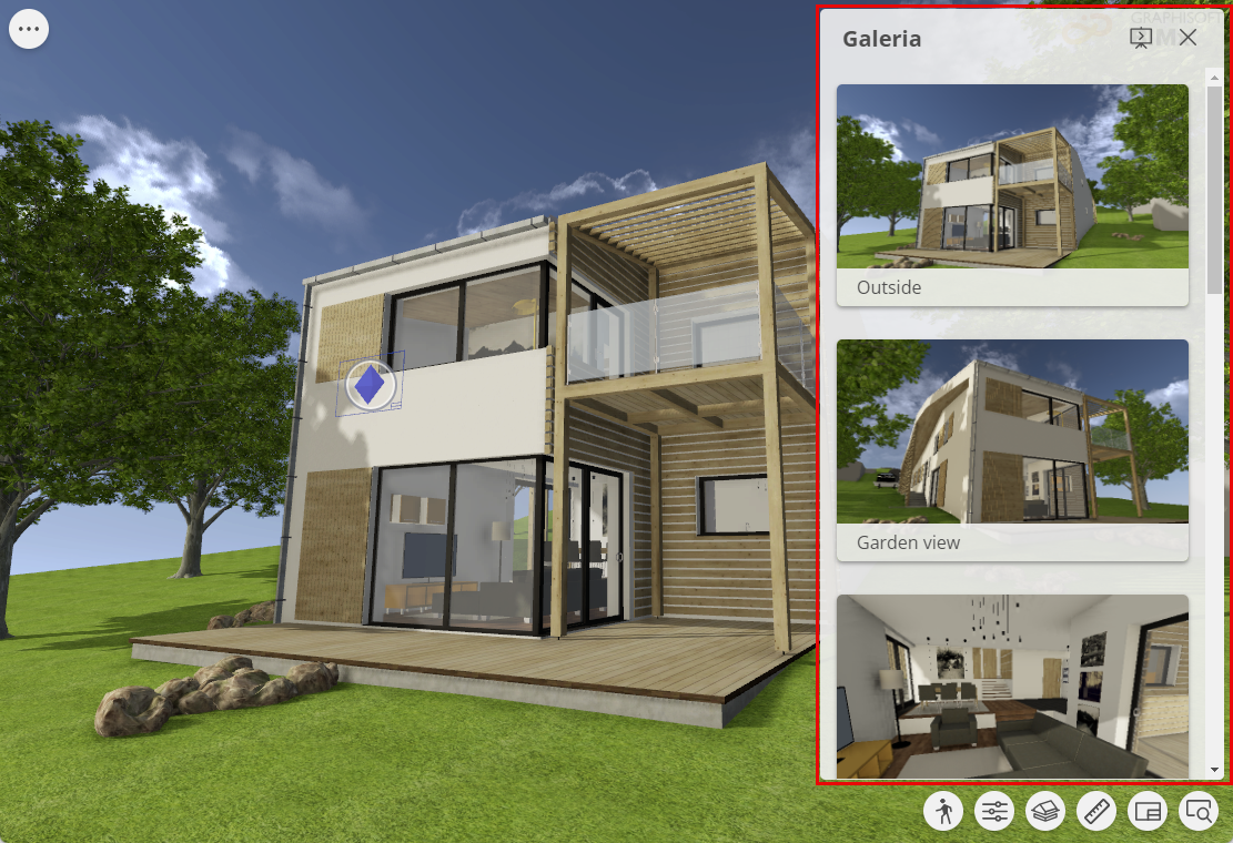 Model 3D Twojego pliku BIMx Hyper-model może zawierać galerię jednej lub więcej zapisanych, nazwanych pozycji kamery: obrazów statycznych 3D, lub animacji. Elementy galerii w BIMx są opcjonalne; są one dostępne, jeśli zostały zdefiniowane w Archicadzie podczas publikowania hipermodelu.