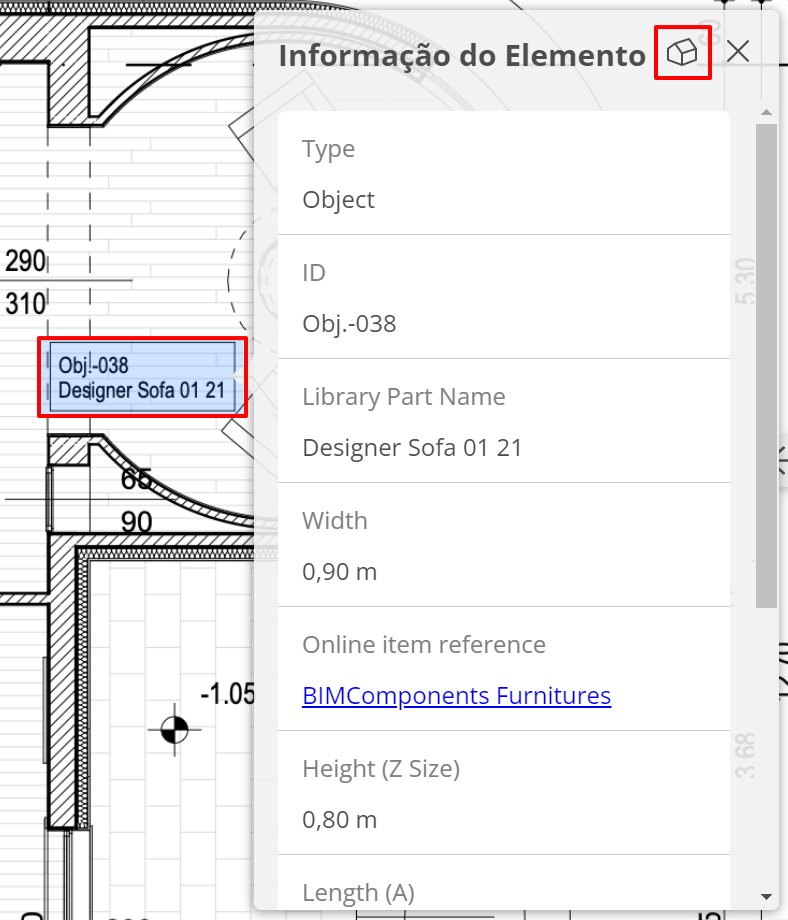 Clique em um rótulo para acessar os dados do elemento BIM do leiaute