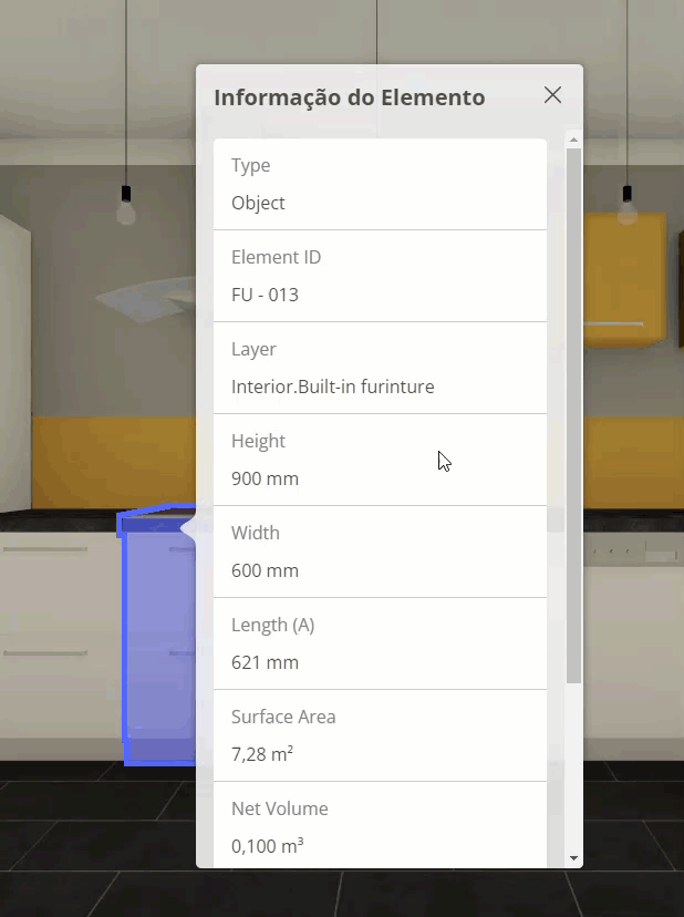 Para modelos do Archicad: Os dados mostrados nas informações do Elemento dependem das definições encontradas em “Definir Informações” conforme estabelecido no Archicad (quando você salvar o Hiper-modelo BIMx, em Propriedades dos Conjuntos de Publicador/Definir Informações).