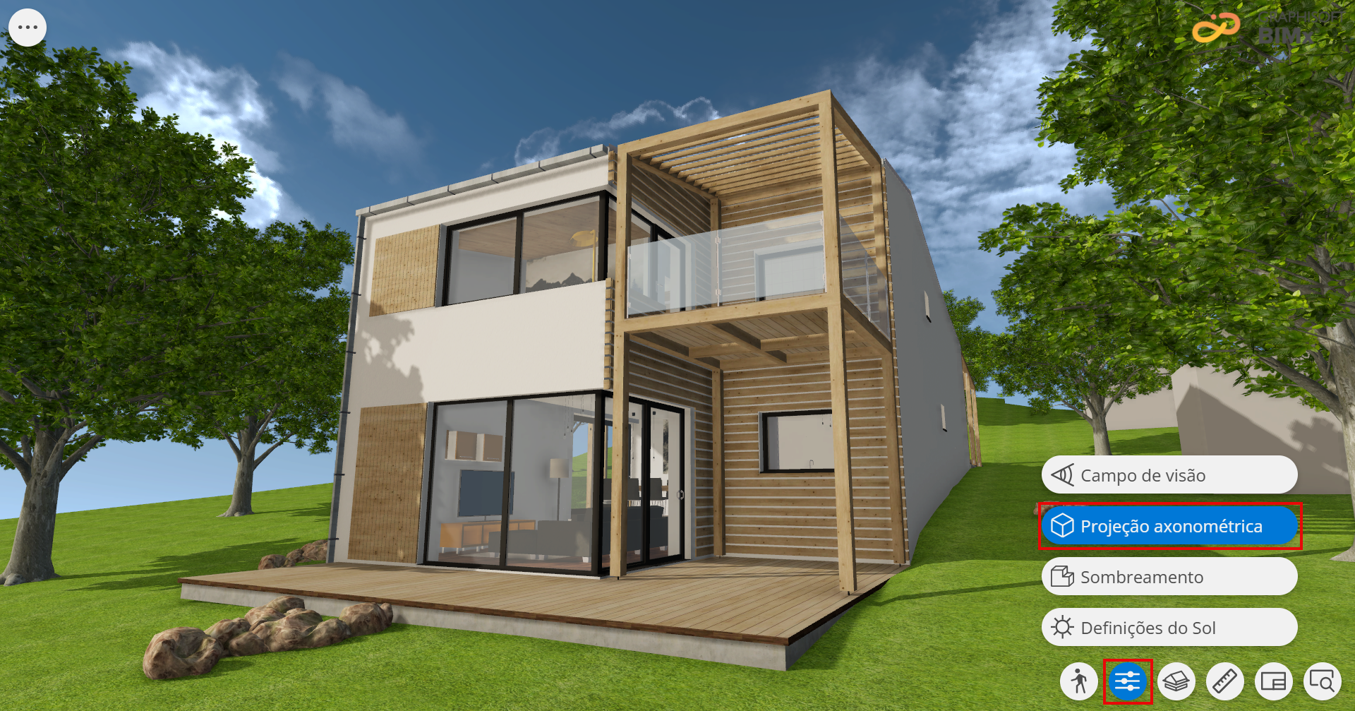 Dica: Ao clicar ou tocar duas vezes em um elemento colocará o edifício em vista frontal. Isso ajudará a criar vistas fáceis de elevação/corte na axonometria. Você pode combinar isso com um plano de corte, várias configurações de sol por hora e salvar suas vistas favoritas.