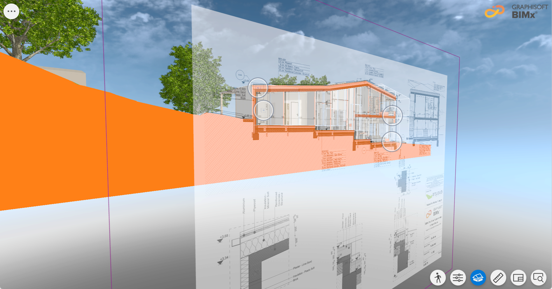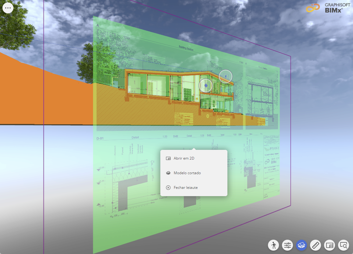 O modelo 3D abre, com o Leiaute sobreposto e cortado horizontalmente ou verticalmente, dependendo do tipo de vista.