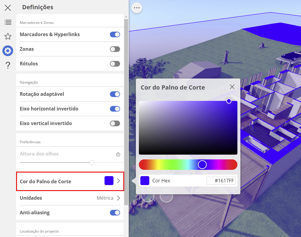 - Passar o cursor sobre a moldura para exibir o plano de corte. É possível alterar a cor do plano de corte utilizando o Selecionador de cor do Plano de Corte nas definições do BIMx. Ver Selecionador de cor do Plano de Corte