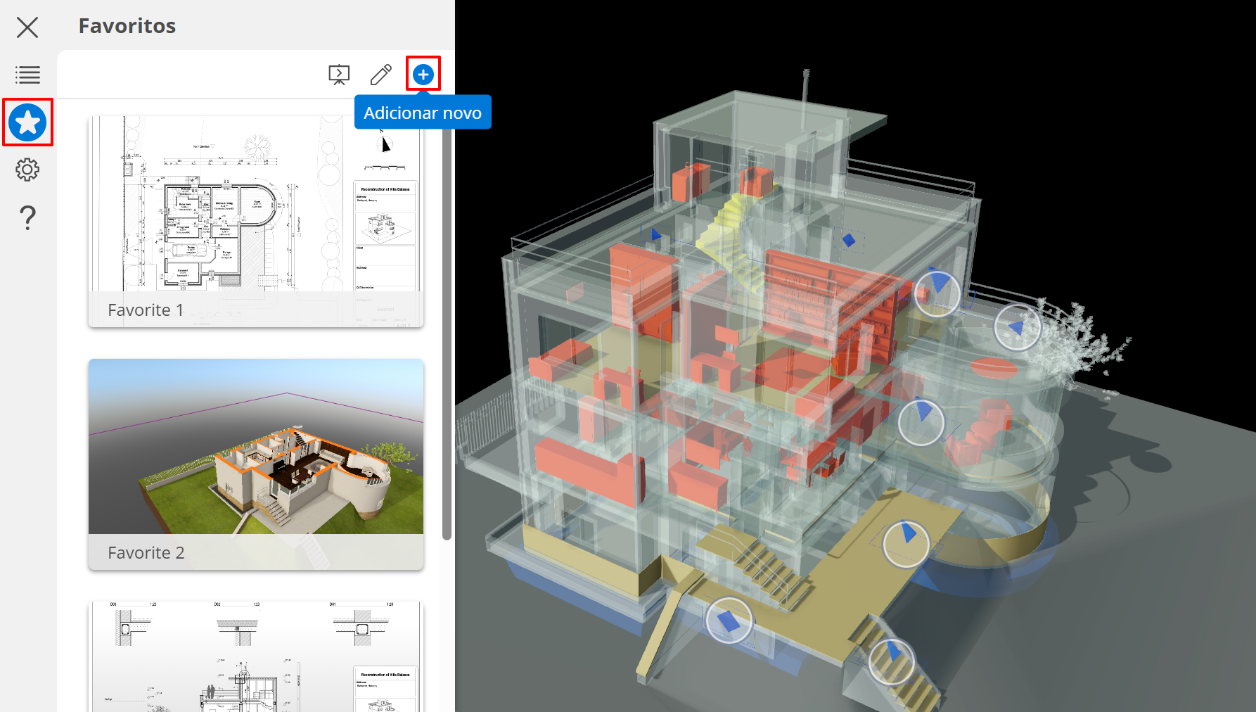 Ao contrário da Galeria (que contém posições de câmara guardadas a partir do modelo 3D do Archicad), os Favoritos são guardados no BIMx a partir de qualquer item 2D ou 3D no Hiper-Modelo, incluindo todas as definições 3D da forma que desejar. Pode editar facilmente a ordem e a visibilidade das apresentações dos Favoritos no BIMx.