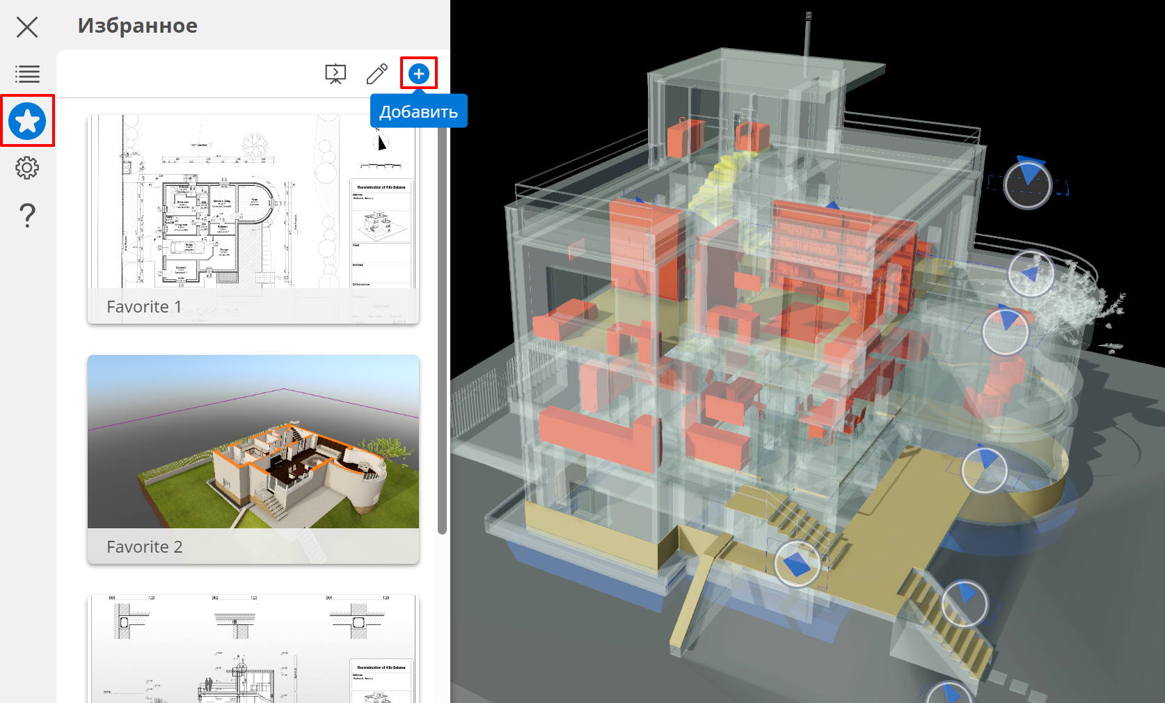 - В меню BIMx нажмите кнопку со звездой, чтобы открыть панель Избранного.