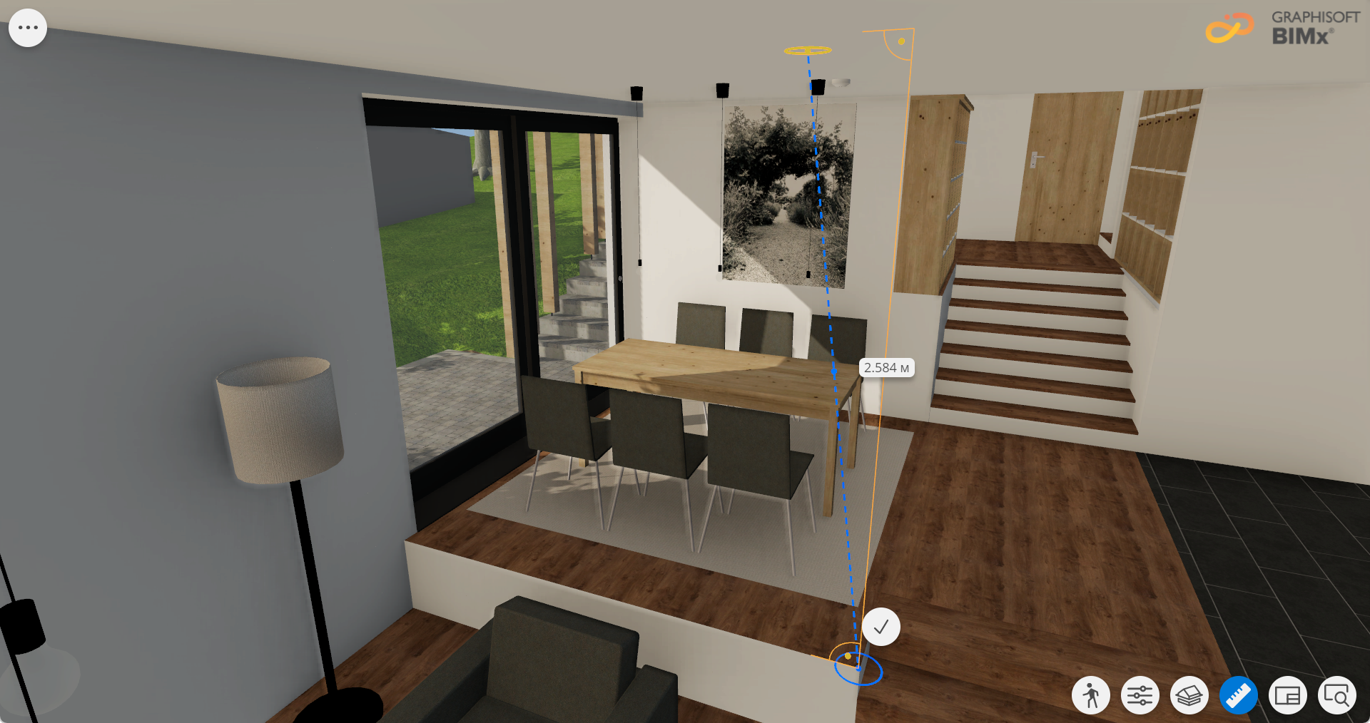 Откройте любой 3D-вид, присутствующий в Гипермодели BIMx. Инструмент Измерения в 3D работает практически так же, как и в 2D, но со следующими отличиями: